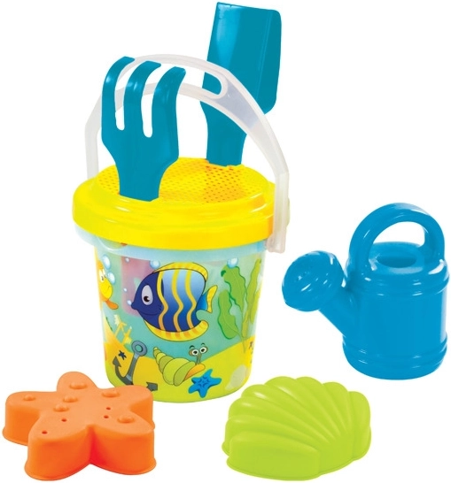 Et sjovt gennemsigtigt sæt til sandleg til børn i tre motiver – feer, dinosaurer og fisk – bringer masser af sjov i sandkassen og på stranden. Indeholder en spand på 1,3 l, rive, skovl, si, vandkande og to sandforme. Fremstillet i EU af kvalitetsplast.