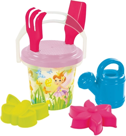- Komplet udstyr: spand 1,3 l, rive, skovl, si, vandkande og 2 tematiske sandforme