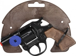 Politirevolver – metal, sort til knaldhætter – otte skud. Revolverens størrelse 13 × 8,5 cm. Fremstillet i Spanien.
