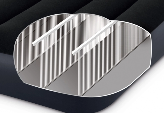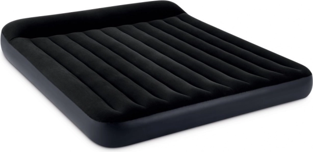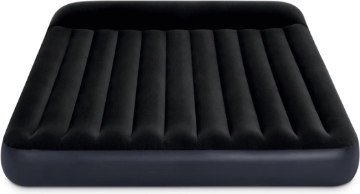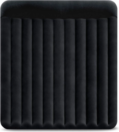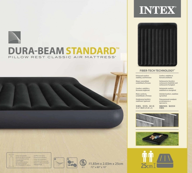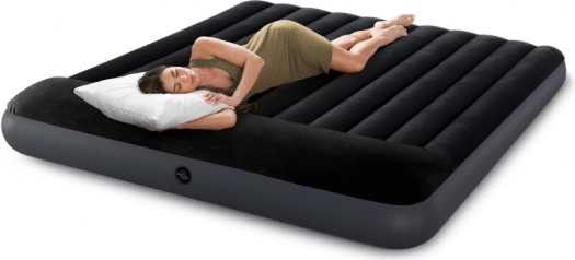 Den oppustelige seng fra INTEX i størrelsen 183 × 203 × 25 cm kombinerer stabilitet og komfort til gæster hjemme og på farten. Den indvendige Fiber-Tech-konstruktion af tusindvis af stærke polyesterfibre giver jævn støtte til kroppen, mens den flockede (ruskindslignende) overflade er blød at røre ved og forhindrer lagenet i at glide.
