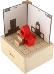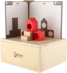 Sættet er designet til børn fra 3 år, og alle stykker er sikkert opbevaret i en trækasse med dimensioner på 18,5 x 16 x 9 cm. Børn kan prøve at samle klodserne efter kortene og matche begge sider, hvilket træner deres logik og færdigheder.