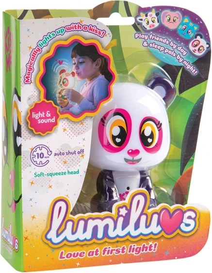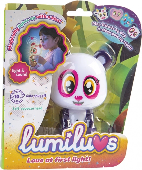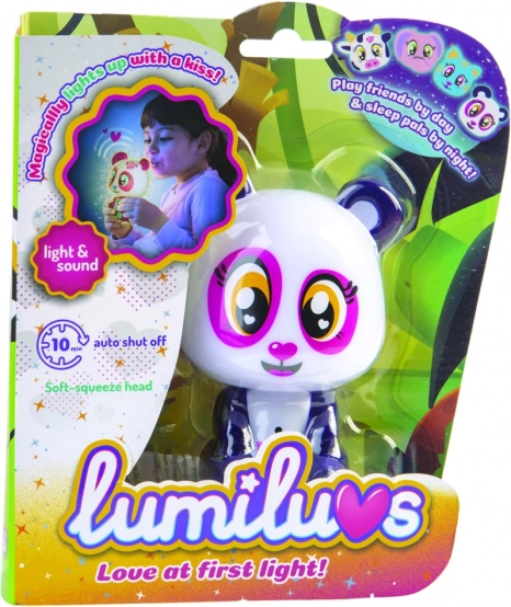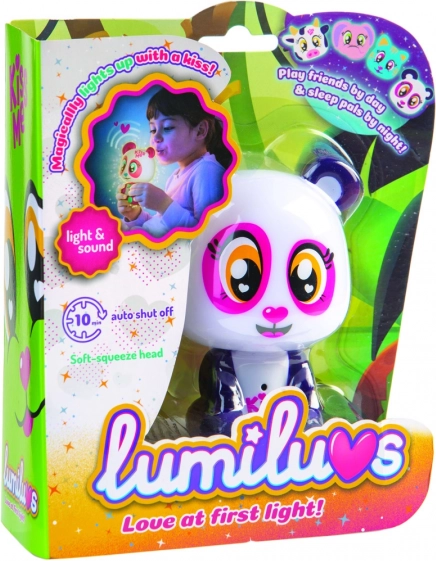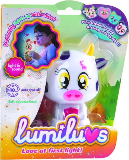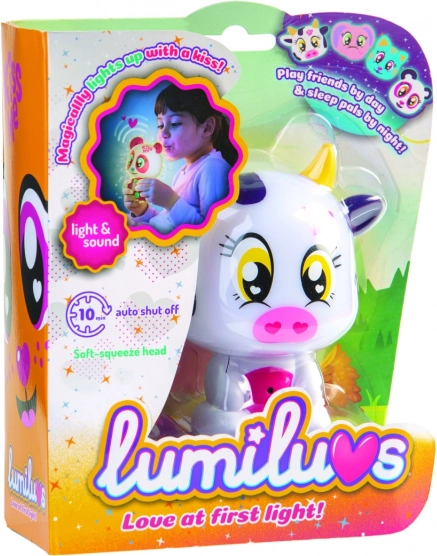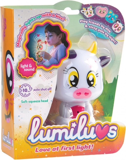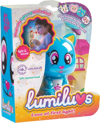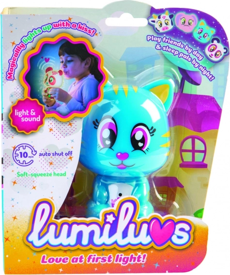 Når du puster på maven og kyssemunden, lyser Lumiluvs-kæledyret og pludrer.