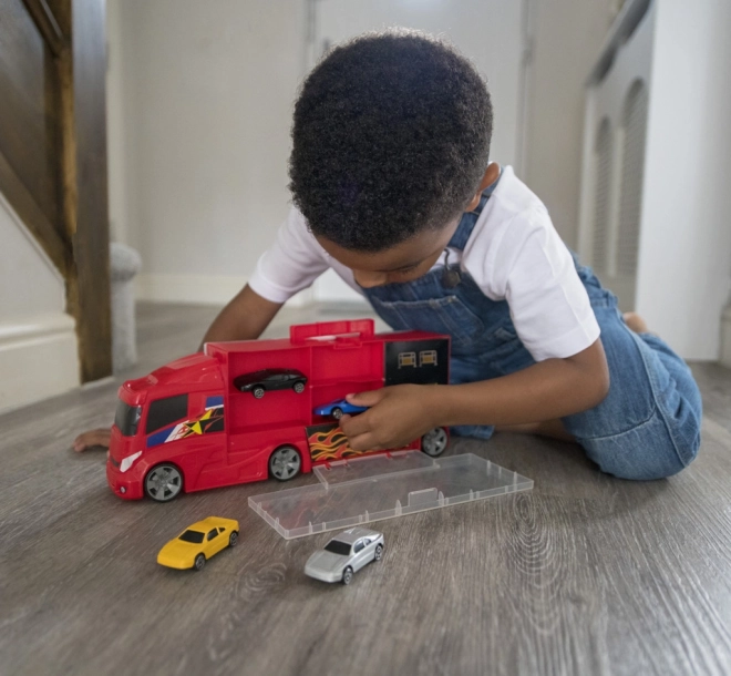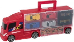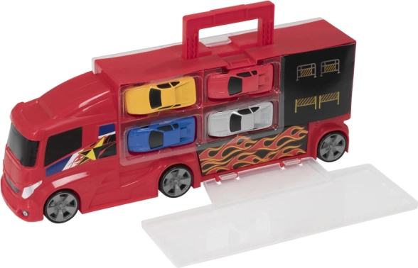 Lastbilen er udstyret med rum til nem lastning og transport af de små biler.