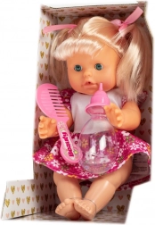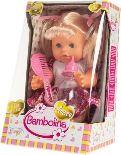 Mød dukken Bambolina Amore, den perfekte ledsager for enhver lille mor. Dukken har realistiske funktioner som at børste hendes lange blonde hår med den lyserøde kam og fodre med sutteflaske, hvilket hjælper børn med at udvikle deres omsorgsevner. Derudover kan dukken tisse, hvilket giver legen en ekstra dimension af interaktivitet og realisme.