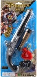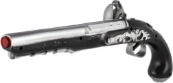 Dekorativ legetøjspistol med graveringer og synlig rød spids for sikker leg giver ekstra flair til enhver piratmission.
