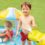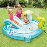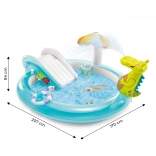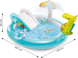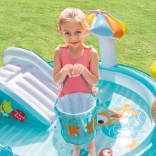 Dette bassin fra mærket INTEX indeholder legeelementer som en oppustelig and og en fiskespand, der højner børns glæde og kreativitet ved leg i vandet. Der er også et oppusteligt rat tilgængeligt, som giver børn mulighed for at lege forskellige spil.