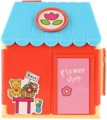 Glad lille hus med blomster-tema og kasseapparat lærer børn at kombinere farver, arrangere og tage sig af kunder.