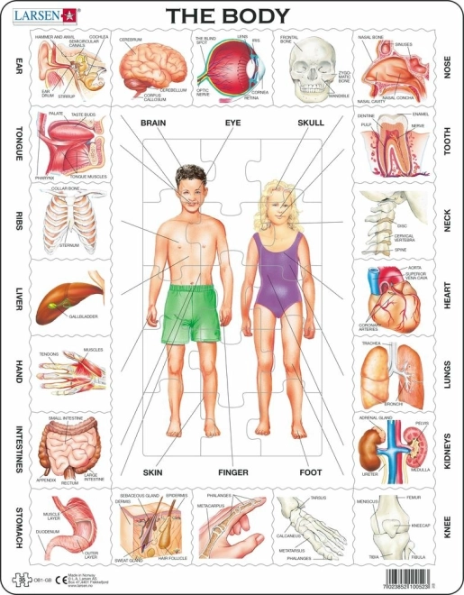 Læringspuslespil LARSEN Vores krop, 35 brikker. Solide kartonbrikker, tydelige organsystemer, udvikler logik og fantasi. Til børn fra 4 år.