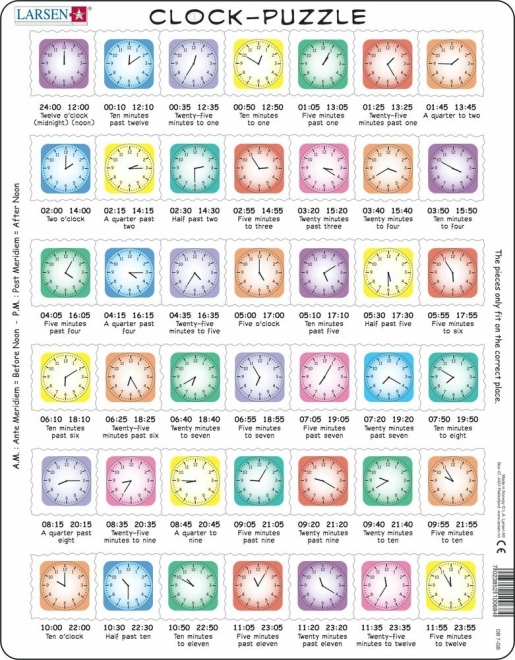 Hvad er klokken? Lær børn at aflæse tiden på analoge ure på en sjov måde med LARSEN-puslespillet. Dette kvalitetsrige, pædagogiske puslespil med 42 brikker udvikler logisk tænkning, rumlig forestillingsevne og tålmodighed. Hver brik har en unik form og passer kun ét sted, hvilket gør indlæringen lettere og øger motivationen for at lægge puslespil. Velegnet til børn fra 4 år.