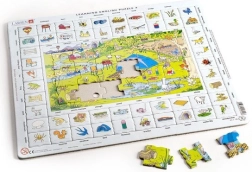 Larsen puslespil Engelsk er især til dem, der kan lide at lære på en underholdende måde. På en eng ved landsbyen eller ved en sø kan du opdage forskellige figurer og genstande, der er nødvendige til camping. Til de alfabetisk ordnede engelske betegnelser langs kanten af puslespillet hører brikker med matchende billeder.