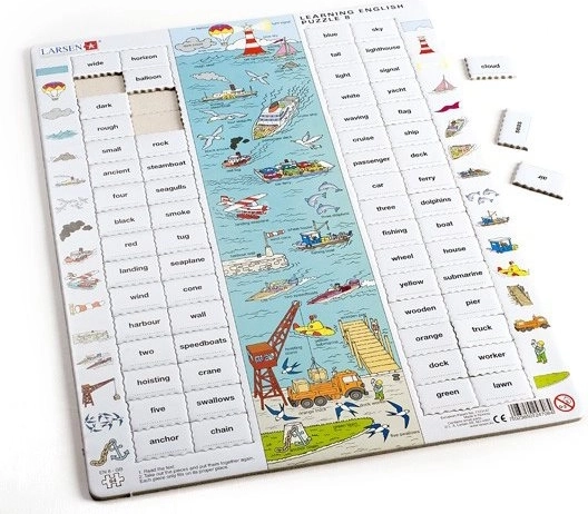 Larsen puslespil til engelskundervisning med 64 brikker. Ideelt til børn. Specielle brikformer og underholdende grafik.