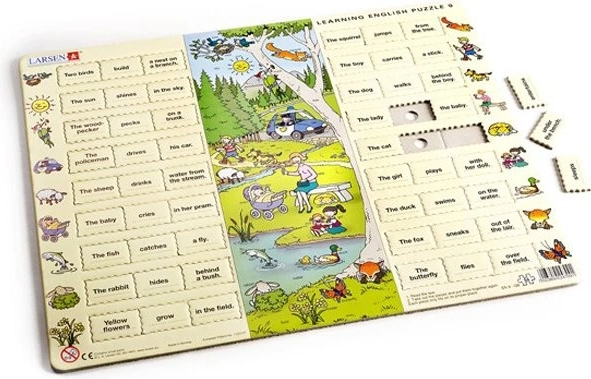 Larsen puslespil engelsk 'Ved skoven' er ideelt til børn, der vil lære at danne mere komplekse engelske sætninger. Takket være billederne i kanten, som man matcher med brikkerne for at danne sætninger, engageres børnene på en legende måde i læringen. Mere øvede børn kan afprøve egne idéer og udvide deres engelske ordforråd.