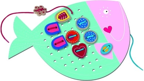 Farverig fisk, der understøtter børns kreativitet og korrekt håndtering af snørebånd ved syning.