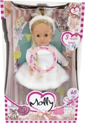 Ved tryk kan hun afspille 3 muntre sange, som understøtter interaktiv leg. Blinkende øjne og ansigtsdetaljer giver dukken et levende udtryk, mens den robuste udførelse egner sig til daglig leg.