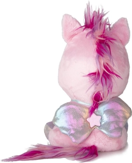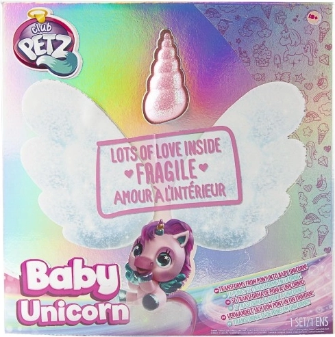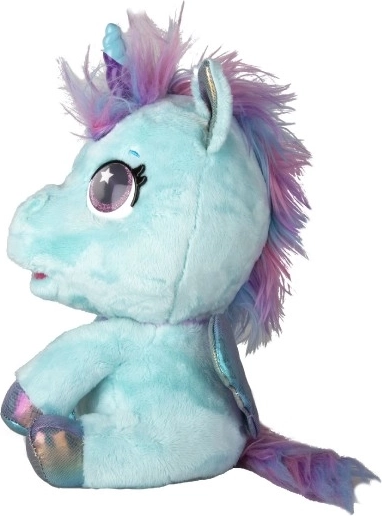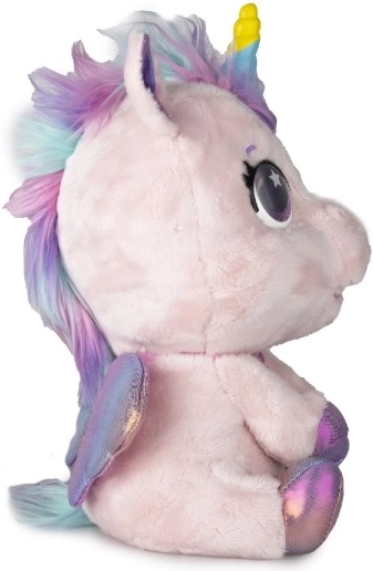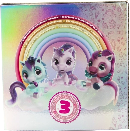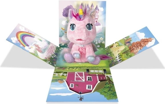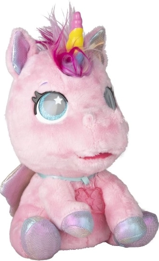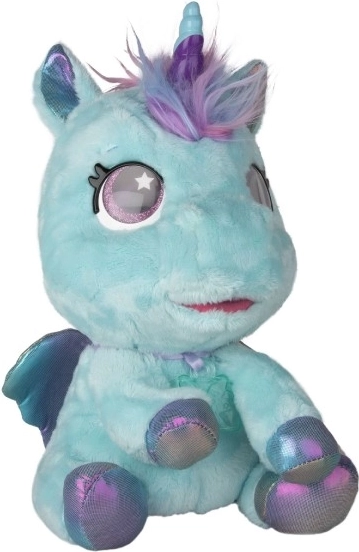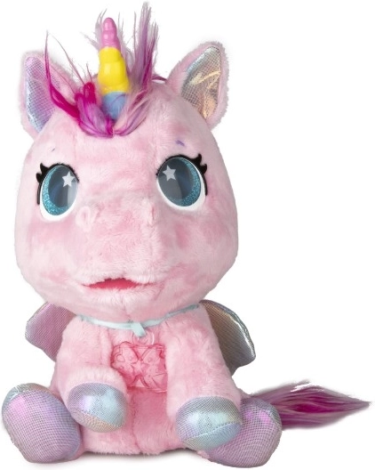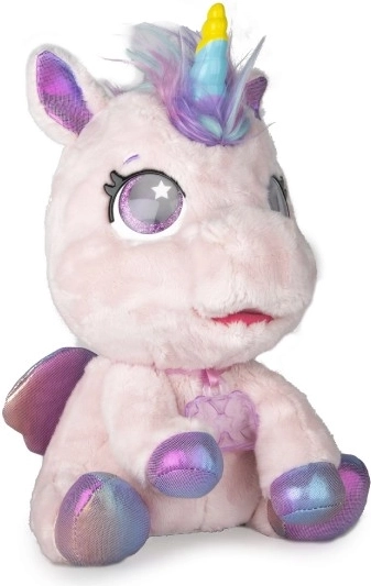 Interaktiv plyset pony, der bliver din nye bedste ven. Den reagerer på berøring og omsorg med mere end 30 lyde og handlinger – fra glade vrinsk til blide nynnelyde. Gennem en gradvis forvandling i tre magiske faser kan du se, hvordan det farverige horn vokser frem, og ponyen bliver til en smuk enhjørning.