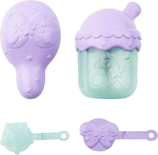 Pakken indeholder 9 tematiske tilbehør, der giver masser af fantasileg: sutteflaske til fodring, kam, regnbuevinger, spænder, klistermærker, vedhæng og adoptionscertifikat. Der findes 3 farvevarianter (hvid, lyserød, blå), så enhver lille troldmand eller troldkvinde kan finde sin favorit.