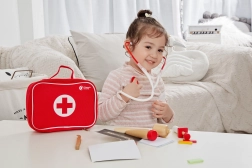 Sæt fra Classic World indeholder alt, hvad en lille læge behøver for at lege læge. Børn kan lytte til patienternes hjerteslag (plysbjørne, dukker) med stetoskop, 'måle' temperaturen med termometer, 'give' injektioner eller uddele nødvendige medicin. Lægeleg er ikke kun en populær rolleleg, men også en læring i empati og deltagelse, hvilket er meget vigtigt for sociale relationer. Dette sæt støtter udviklingen af fantasi og læren i problemløsning.