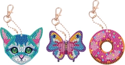 Dette sæt lader dig lave tre forskellige nøgleringe i form af en ugle, en is og et hjerte. Hver nøglering er pyntet med farvede sten, der giver dine nøgler en personlig stil.