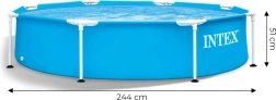 Havebassinet INTEX Metal Frame med en diameter på 244 cm giver både børn og voksne forfriskning og sjov. Takket være den solide metalkonstruktion og det holdbare trelags PVC er bassinet stabilt, sikkert og klar til daglig brug i varme perioder. Den enkle og hurtige montering gør, at du kan fylde vand på uden unødig ventetid.