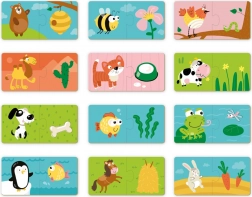 Børnepuslespillet “Hvad spiser dyrene?” lærer de mindste at matche dyr med deres yndlingsmad. Takket være det enkle system med 12 par træner børn observation, koncentration og hånd–øje-koordination, samtidig med at de lærer nye begreber på en sjov måde.