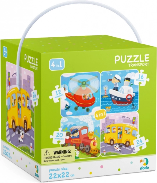 Opdag det sjove, progressive puslespil med temaet transportmidler fra mærket DODO. Sættet indeholder 4 puslespil med stigende sværhedsgrad på 12, 16, 20 og 24 brikker, ideelt til at udvikle børns tålmodighed, logik og finmotorik. Hvert færdiglagt puslespil måler cirka 22 × 22 cm.