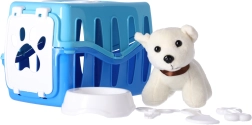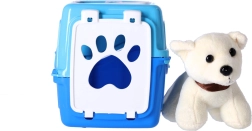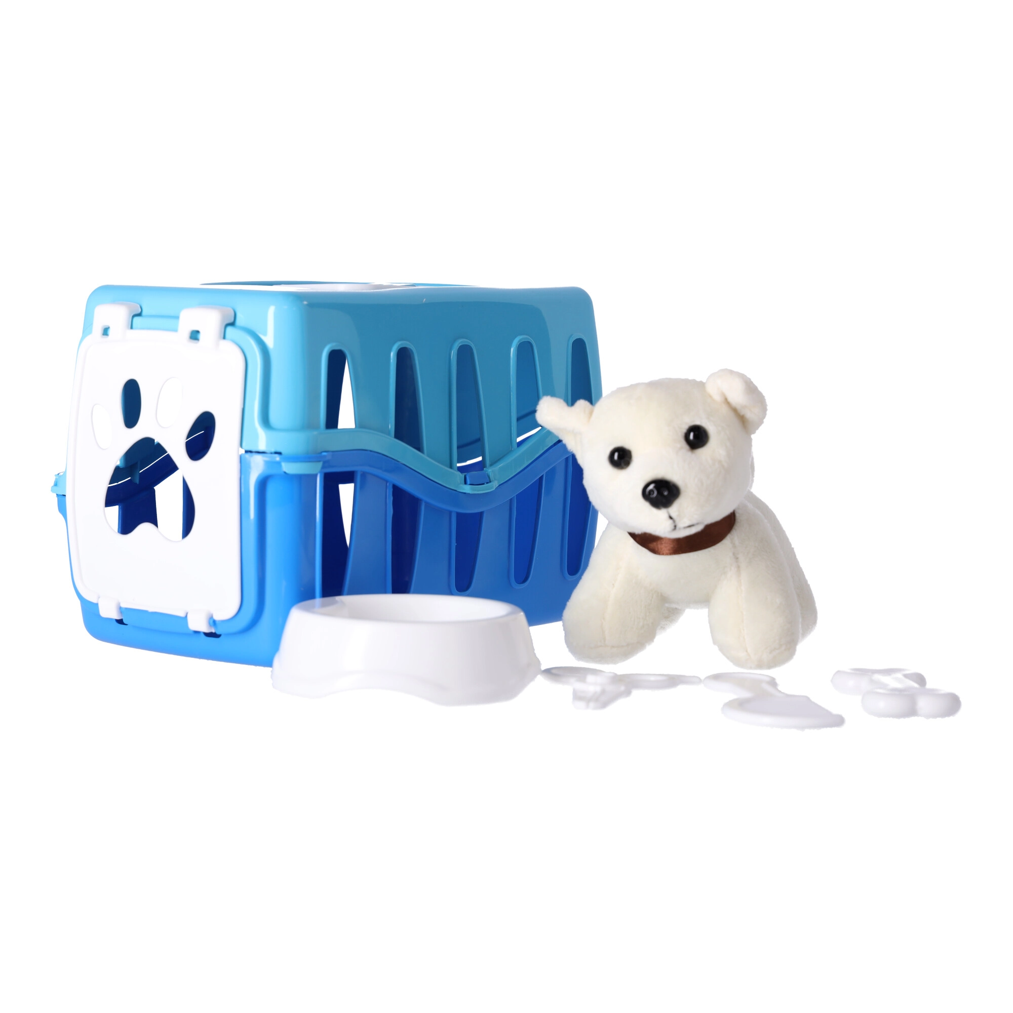 Hund i blå transportkasse. Legetøjssæt indeholder en plyshund, kasse, skål, saks og et lille ben. Opfylder de strengeste EU-standarder. Fremstillet af sundhedsmæssigt ufarligt materiale.
