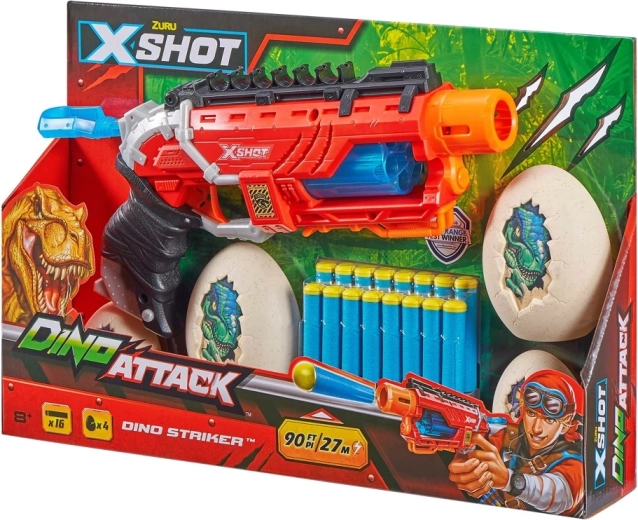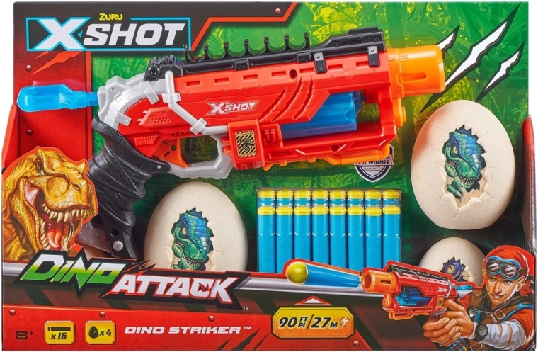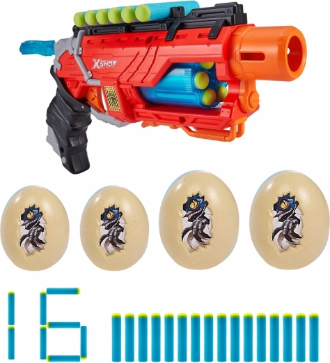 Pas på! Dinosaurerne angriber! Ødelæg deres æg og stop deres videre formering. Dette unikke våben giver dig en rækkevidde på op til 27 meter. Det roterende magasin muliggør hurtig skydning. Derudover kan du fastgøre ekstra skud i de praktiske holdere på den øverste del af våbnet. Våbnet er sikkert, fremstillet af kvalitetsplast og giver dig præcis skydning. Alder: 8+, indeholder: våben, 16 skud og 3 dinosauræg.