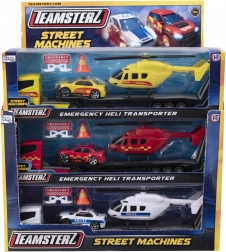 Vi præsenterer Teamsterz transport af bil og helikopter, det perfekte sæt til små transport- og redningsentusiaster. Hvert sæt indeholder en lastbil, der transporterer en bil og en helikopter. Tilgængelig i tre forskellige farver - rød, gul og hvid.