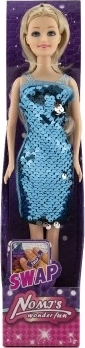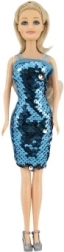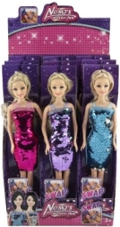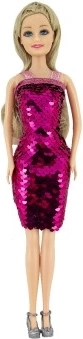 Denne elegante dukke er klar til både fest og modeshow. Kjolen med dobbeltsidede palietter giver øjeblikkelig underholdning – med et enkelt strøg kan du ændre farveeffekten og skabe en ny stil på et øjeblik. Den faste plastkrop muliggør en stabil stående position og let omklædning.