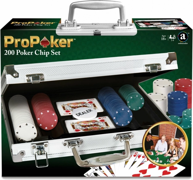Flot, professionel kuffert med udstyr til poker. Spil, nyd det og vind. Du har 200 jetoner til rådighed.