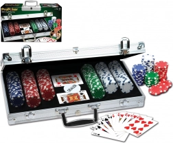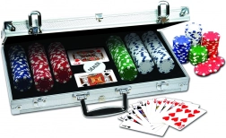 Komplet pokersæt i en elegant aluminiumskuffert til hjemmeturneringer og hygge med venner. Indeholder 300 kvalitetsjetoner med en vægt på 11,5 g i 4 farver med terningesymboler – ideelt til en autentisk spilleoplevelse.
