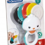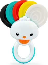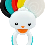 Denne farverige rangle med regnbuepåfugl-motiv vil glæde både børn og forældre. Kuglerne indeni skaber ved rotation en behagelig effekt af blid regn, som beroliger og underholder barnet. Den bløde påfuglehale fungerer som en bidering og giver lindring ved tandfrembrud, mens de teksturerede elementer hjælper små hænder med at få et godt greb.