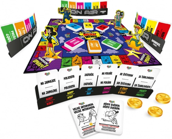 - Spilleplade, 6 sæt NYHEDSKORT, 6 reporter-brikker, 1 spilleplade, 1 timeglas (30 sekunder), 6 nyhedsstudier, vejledning