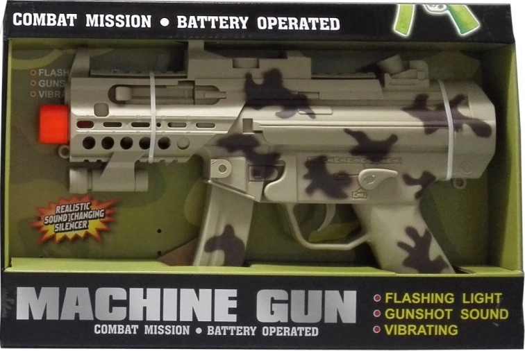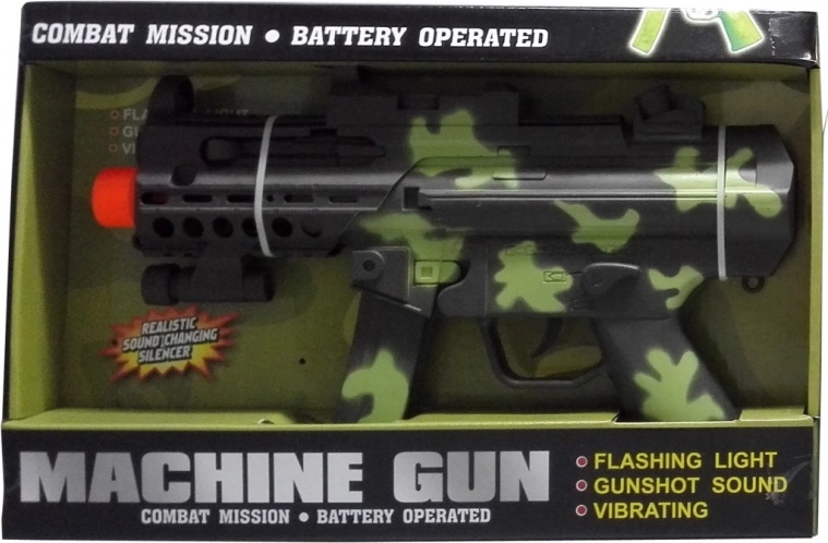 Legetøjsmaskinpistol med lys og lyd. Understøtter fantasi, koordination og kreativitet. Drevet af 3× AA (medfølger ikke). Velegnet fra 3 år.