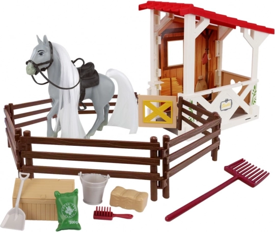 Oplev landlivets charme med sættet stald med lille hest og indhegning, som vil glæde enhver lille hesteelsker. Sættet indeholder stald, indhegning og praktiske tilbehør til pleje af hesten – foder og redskaber. Legen udvikler finmotorik, kreativitet og fantasi. Velegnet til børn fra 3 år.