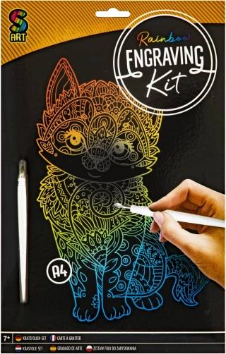 Det sorte dæklag bliver ved skrabning til livlige regnbuefarver. Skab et detaljeret kattemotiv uden behov for farver eller lim – den medfølgende pen er nok.