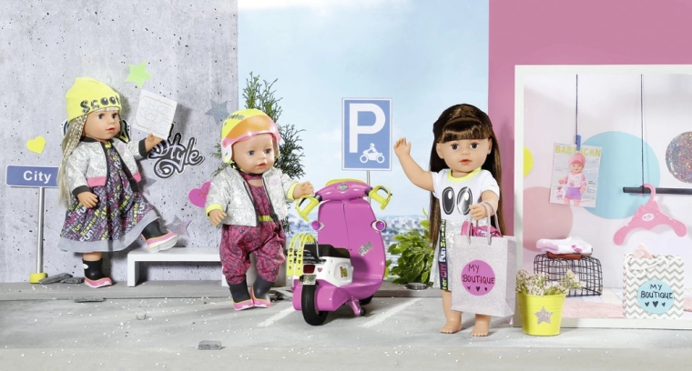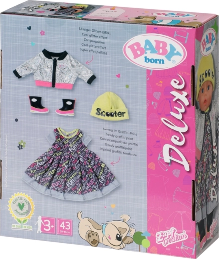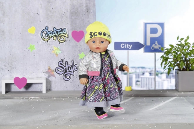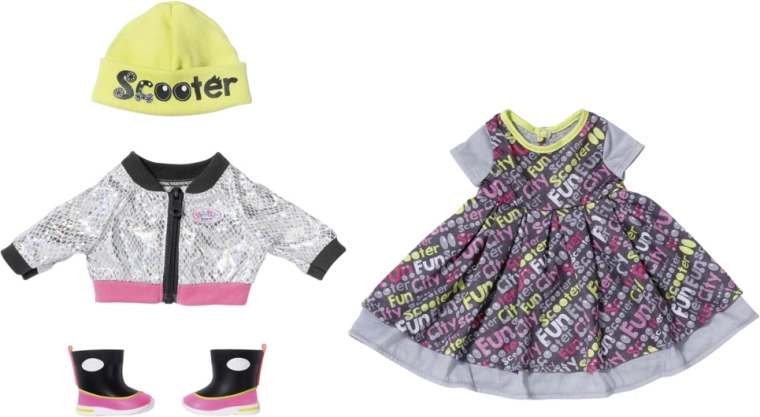 Takket være de lagdelte kjoler og den gule hue ser BABY born-dukken meget elegant ud i de travle bygader. Som beskyttelse mod vinden bærer hun en jakke med skinnende sølvprint. De seje sko sprudler af farver og fuldender looket. • Maxi-kjole i rockstil med print. • Moderne jakke med spejleffekt. • Hue i neonfarver med teksten “Scooter”. • Farvekoordinerede sko fuldender sættet. • Til dukker i størrelsen 43 cm. • Kan håndvaskes i lunkent vand. Må ikke tørretumbles. • Emballage: plastfri – gaveæske med produktbilleder.