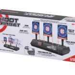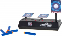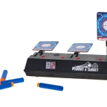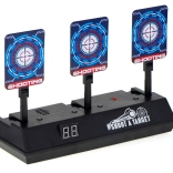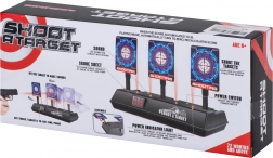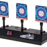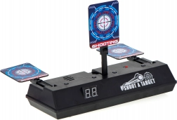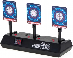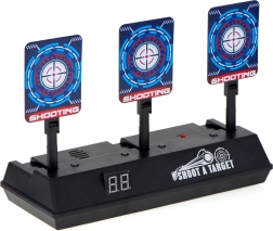 Skiven kan bruges med skumdartpistoler og giver en autentisk oplevelse med lyd- og lyseffekter. Når du rammer målet, hører du lyden af knust glas eller applaus. Skiven er udstyret med en digital tæller, som registrerer point. Den nulstilles automatisk, når alle tre mål er ramt.