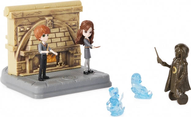 Medfølger: 7,6 cm figurer af Hermione og Ron med bevægelige arme, gennemsigtige Patronusser – en odder og en terrier – samt en træningsmannequin til magiske dueller.