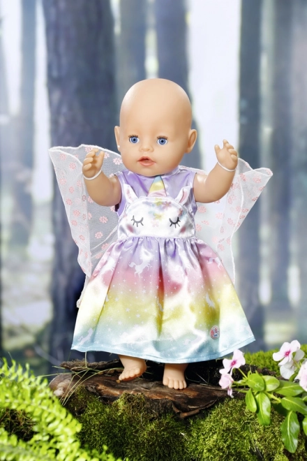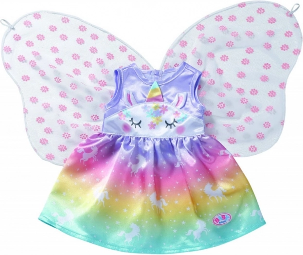 Feer og enhjørninger hører sammen ligesom mælk og småkager. Fe-kjolen til BABY born-dukken er syet af et smukt regnbuefarvet stof. Nederdelen er printet med magiske enhjørninger, der danser på stjernehimlen. Den øverste del af kjolen er foran pyntet med et enhjørningsansigt med påsyede ører og et farverigt horn. En rigtig fe skal selvfølgelig også have vinger. De gennemsigtige vinger med glitrende blomster er syet ind i den bageste del af kjolen, og så snart BABY born stikker hånden gennem den lille løkke øverst på vingerne, folder de sig ud. Originalt tøj til BABY born-dukker. Til fantasifuld, varieret og langvarig leg. BABY born Eventyrkostume Enhjørning til dukker i størrelsen 43 cm. Bøjle medfølger.