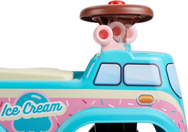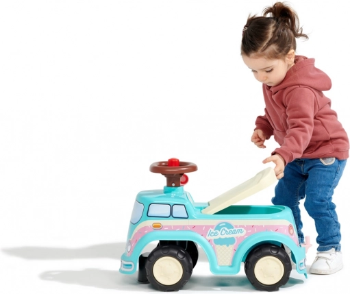 Dette køretøj formet som en isbil har et attraktivt design, der fanger ethvert barns opmærksomhed. Det er udstyret med et rat med horn for suveræn kontrol og sjov.