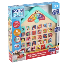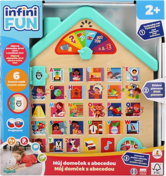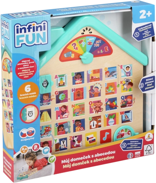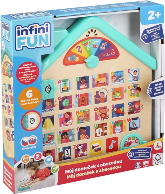 Denne pædagogiske træreol i husform introducerer børn på legende vis til alfabetet og grundlæggende ord. Takket være talte instruktioner på tjekkisk og slovakisk orienterer børn sig let, opdager bogstaver og matcher dem med glade billeder. De elektroniske funktioner på batteri bringer lyd, melodier og læringsglæde.
