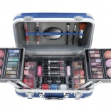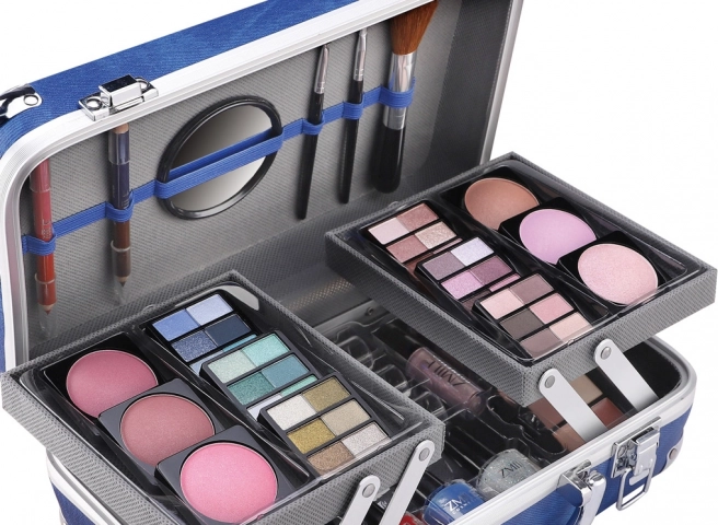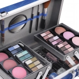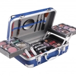 Kosmetisk kuffert med aluminiumsforstærkede hjørner fra Travel Blue med integreret spejl – i alt 84 stk. tilbehør.
