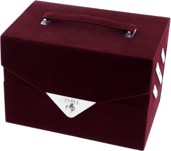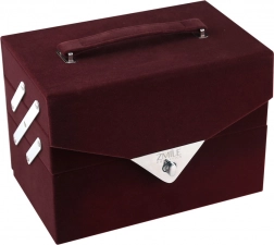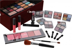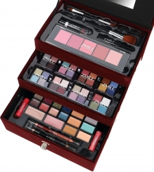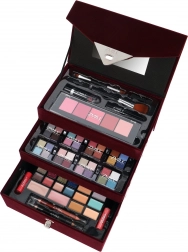 Sammet Kosmetikkuffert Beauty Case Velvety – mørk vinrød fløjl – i alt 74 stk. tilbehør. Indeholder 32× øjenskygger i 4 kompakte kassetter, 5× blush, 3× brynskygger, 1× brynvoks, 4× cremede øjenskygger, 4× glittercreme, 2× øjenskyggeprimer, 8× concealer, 2× lipgloss, 1× læbestift, 1× mascara, 1× dobbeltsidet eyeliner, 1× dobbeltsidet lipliner, 1× blushbørste, 1× dobbeltsidet øjenskyggebørste, 4× dobbeltsidet applikator, 1× integreret spejl. Dermatologisk testet, opfylder EU’s strenge standarder.