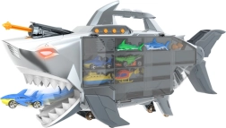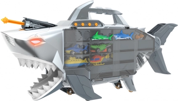 Inde i hajen er der praktiske rum til op til 24 køretøjer. De åbne-lukke-kæber fungerer som en actionfyldt udkørsel for lynhurtig start.