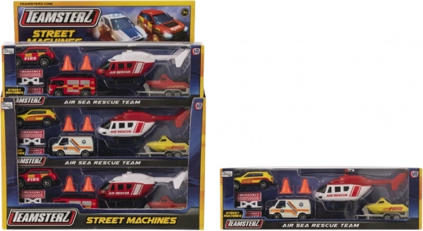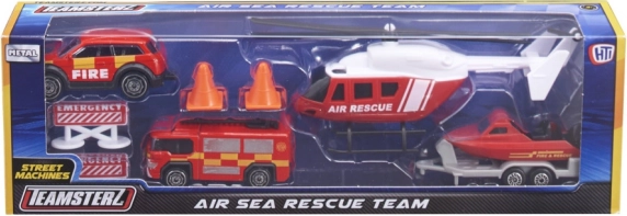 Gør dig klar til dine egne redningsmissioner på land og til vands med Teamsterz-sættet! Her finder du en støbt helikopter med manuelt drejelige rotorblade, et indsatskøretøj, en 4x4 med træk, en båd med trailer og nødstilbehør. Den robuste trykstøbte karrosseri og friløbshjul garanterer timevis af fantasifuld leg for børn fra 3 år.