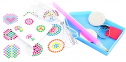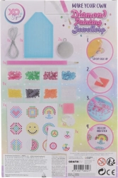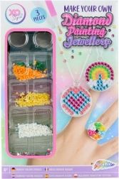 Dette komplette sæt til at lave smykker med diamantmalingsteknikken fremmer fantasi, finmotorik og koncentration. Børn vælger mellem 9 skabeloner til vedhæng og 4 skabeloner til ringe, hælder stenene i bakken og påfører dem nemt på den klæbende overflade med den medfølgende pen. Resultatet er glitrende og unikke accessories, som de stolt kan bære eller give væk.