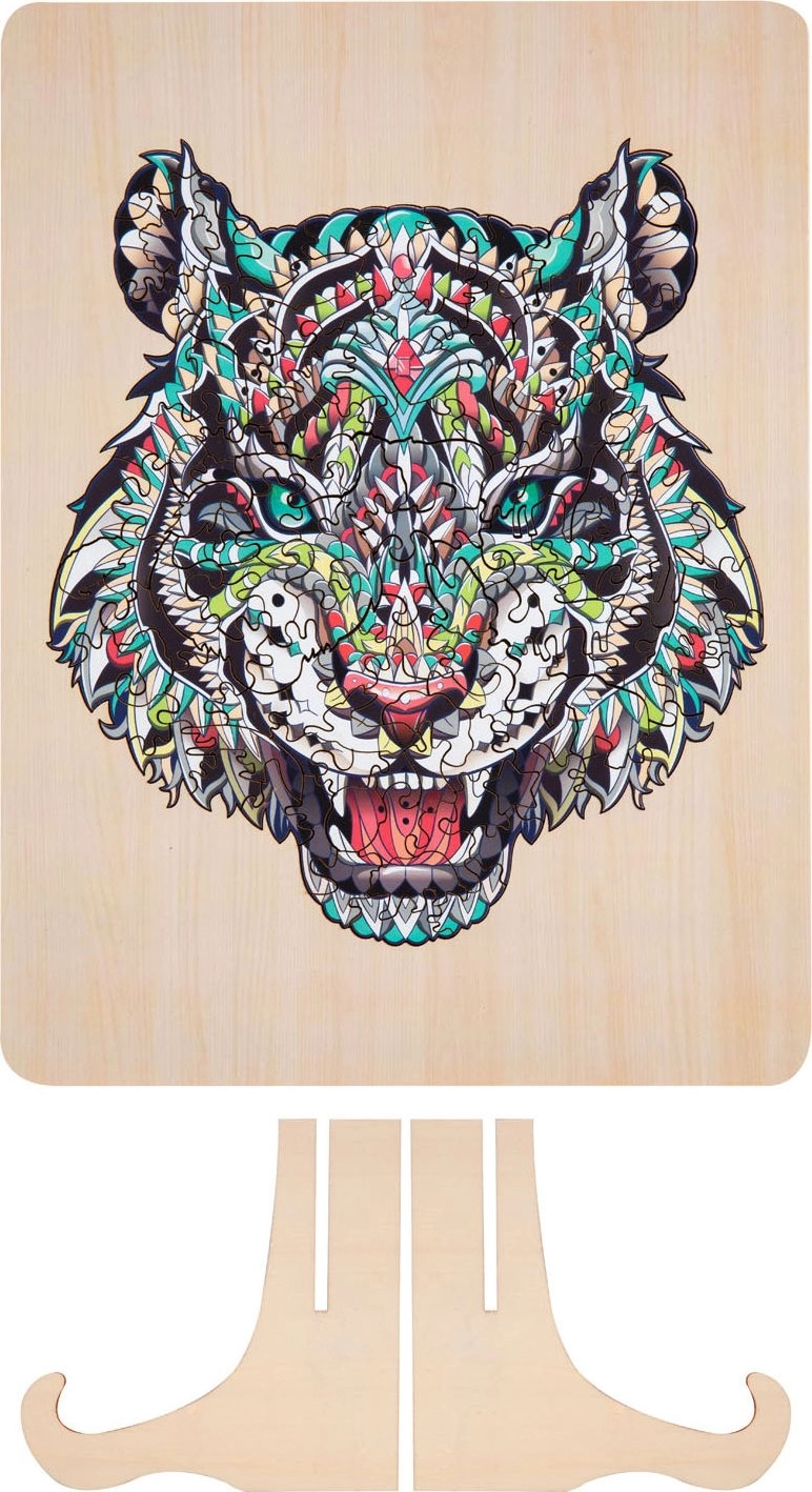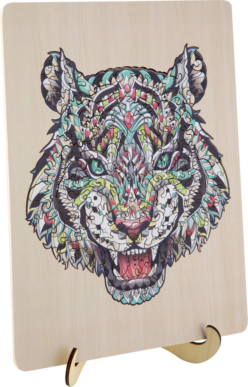 Træpuslespil Tiger 135 brikker – pakken indeholder en stander, hvor du kan udstille dit puslespil. Billedstørrelse 30×22,5 cm.