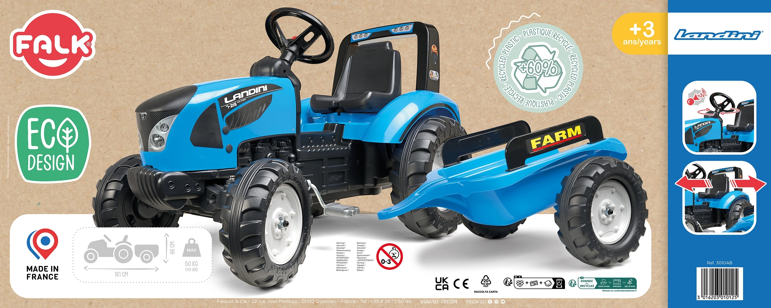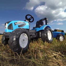 Trampetraktoren LANDINI er et omhyggeligt udført legetøj i højkvalitets plast, som tåler daglige børneeventyr i haven og på legepladsen. Realistiske detaljer som forlygter, robuste hjul og trailer med teksten “FARM” understreger det autentiske look af en rigtig traktor.