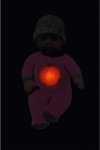 Ved at trykke på hjertet på maven tændes et blidt natlys med en lille and, og en vuggevise afspilles, som hjælper babyen med at falde til ro før søvn.